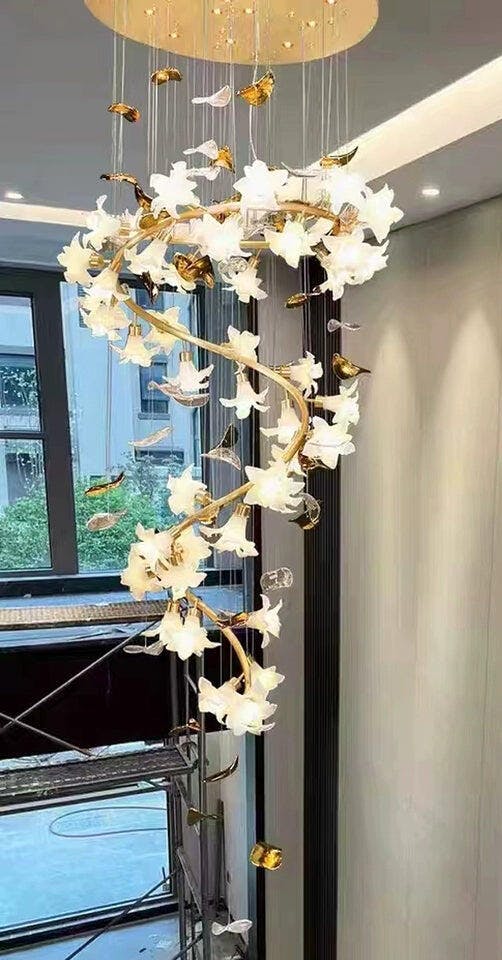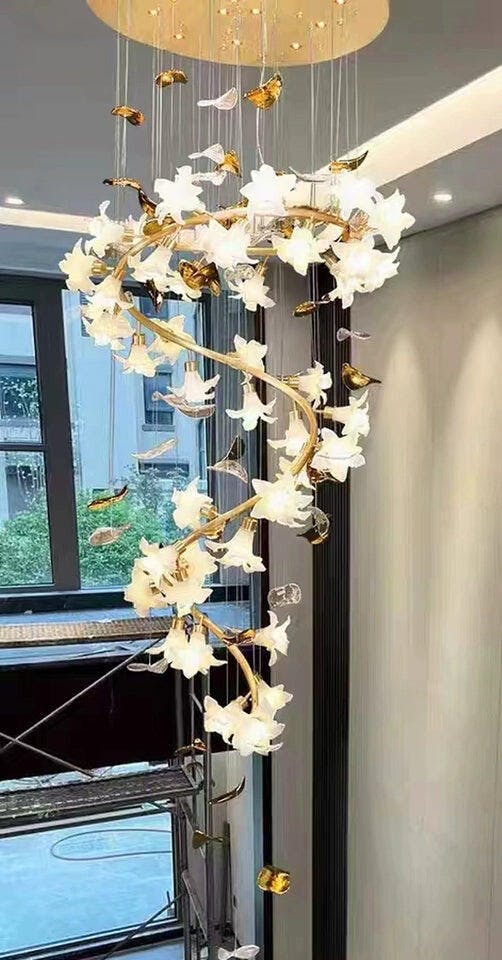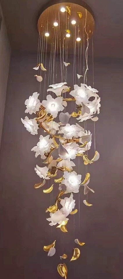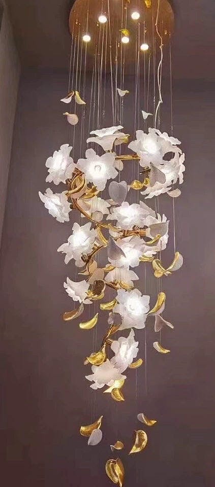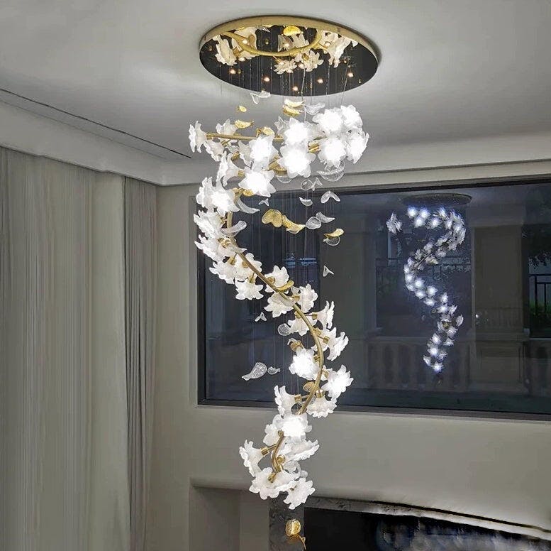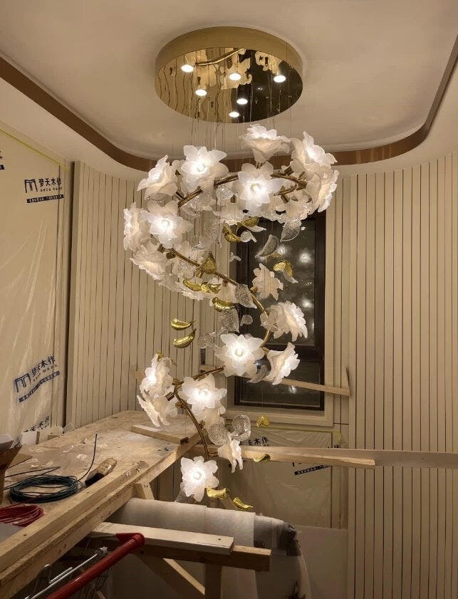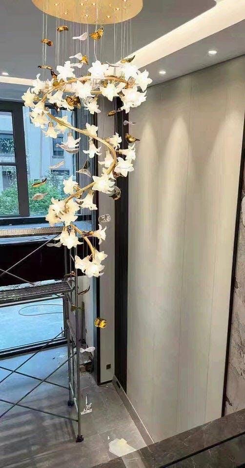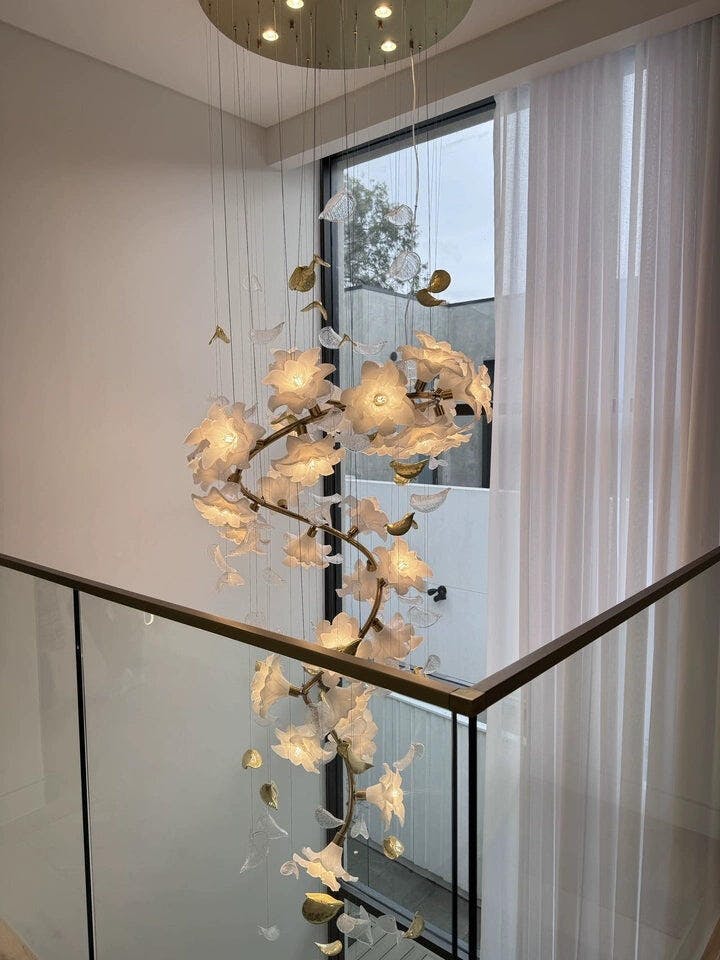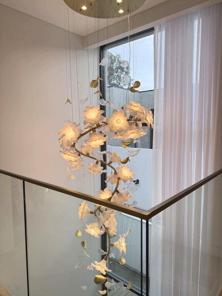 Our Flying Flowers Fluttering Chandelier offers a breathtakingly elegant aesthetic with its ivory glass petals that resemble fluttering petals descending gracefully from the light. Its luxuriously intricate design exudes a sophisticated and exclusive air, elevating the ambience of any interior.