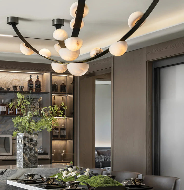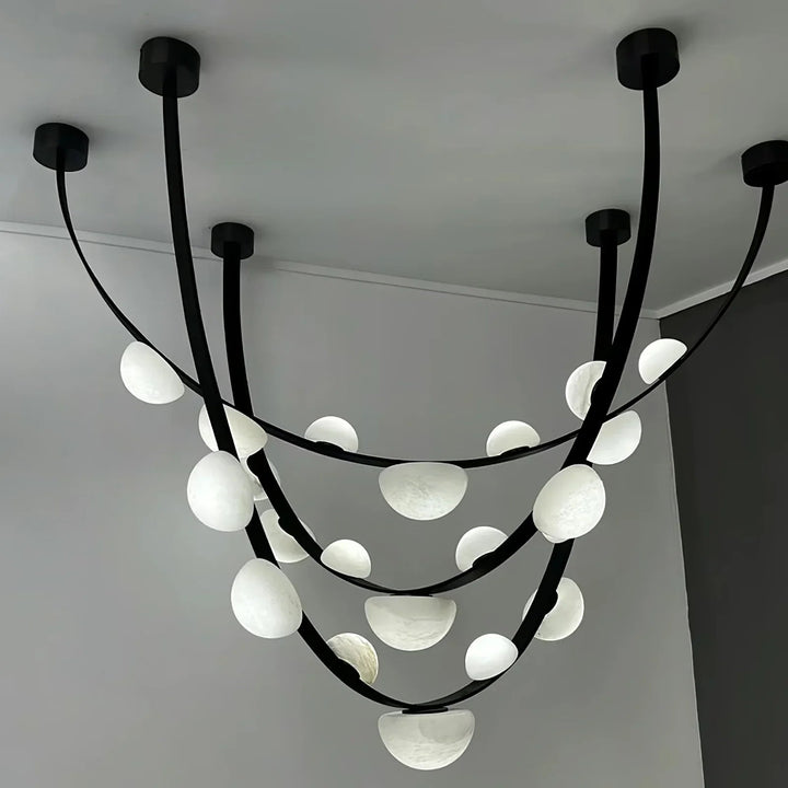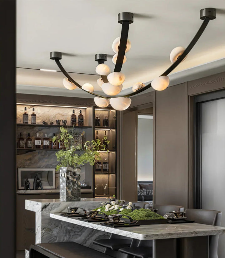 The Dew Drops Alabaster Chandelier draws inspiration from the delicate form of dew drops resting on grass blades, showcasing intricate craftsmanship. This chandelier brings a refined natural elegance to any room, with each element reflecting the exquisite artistry found in nature.