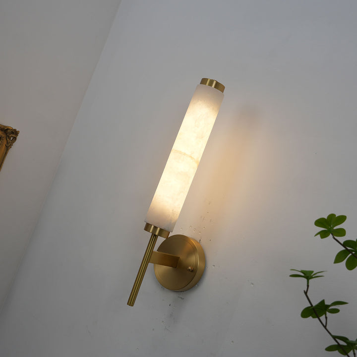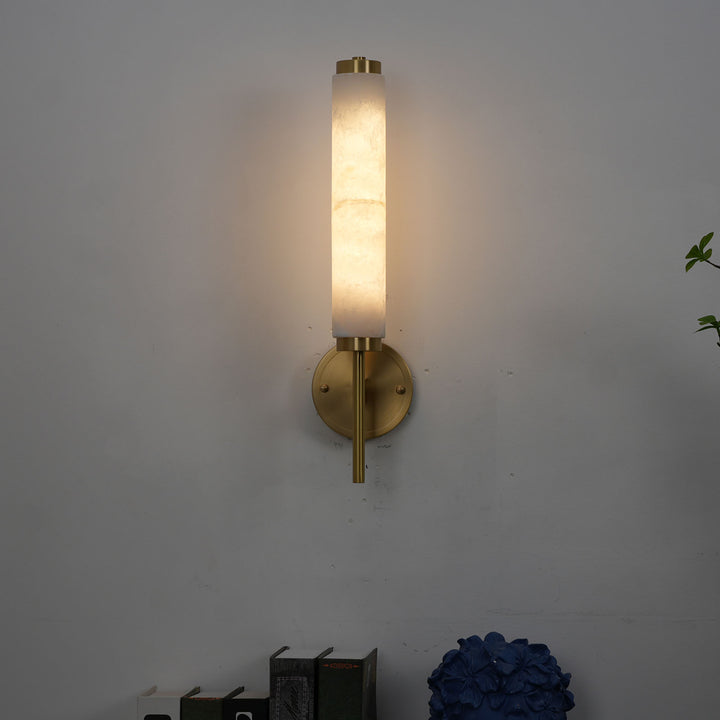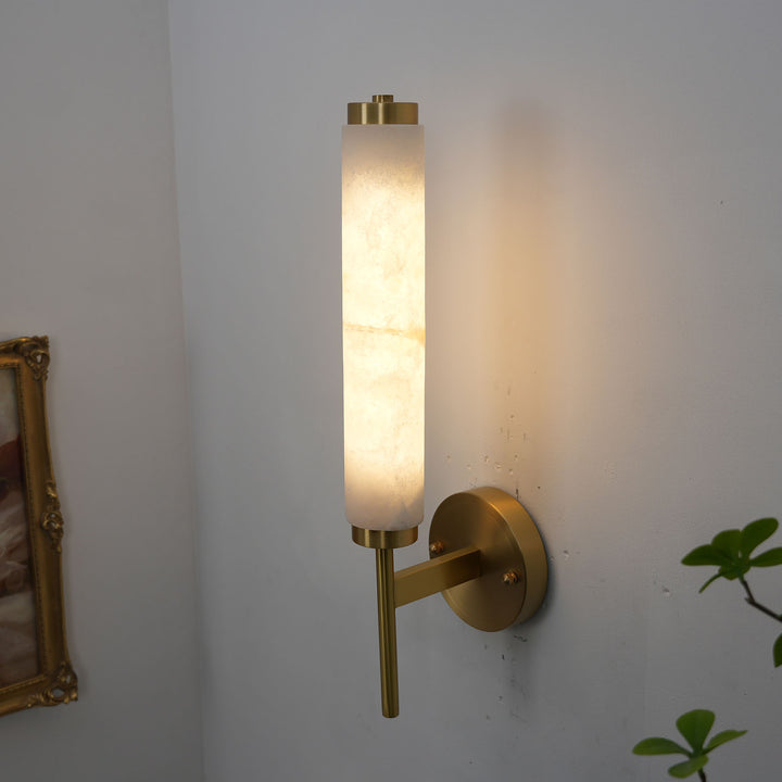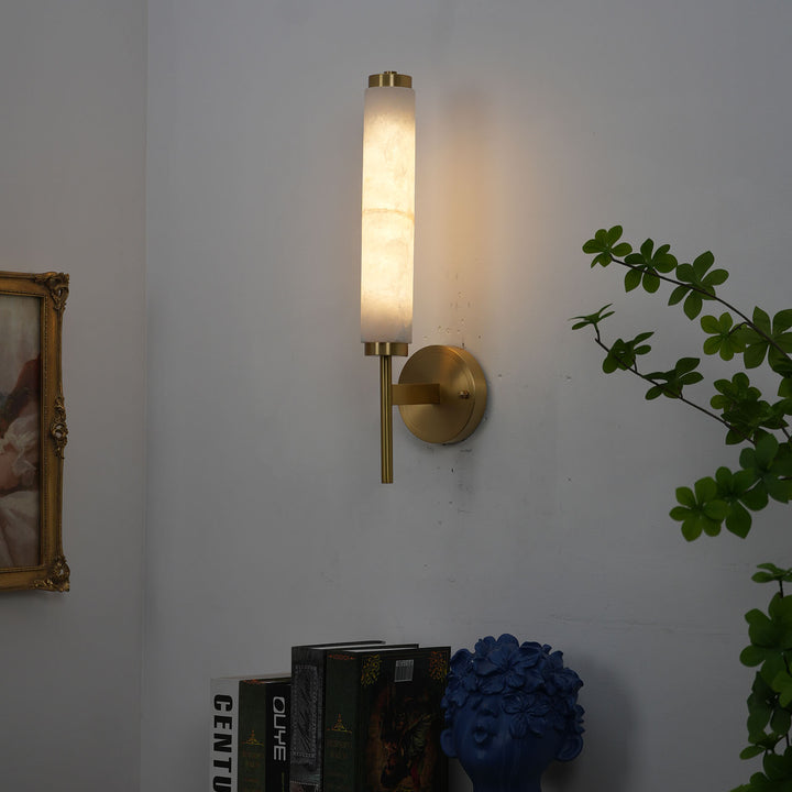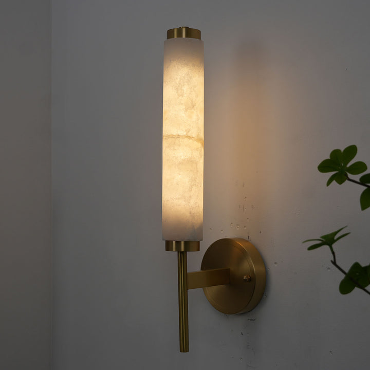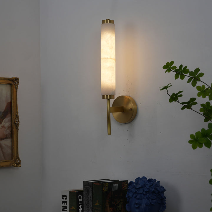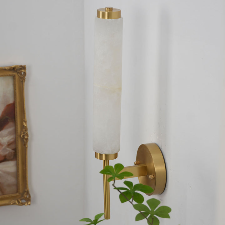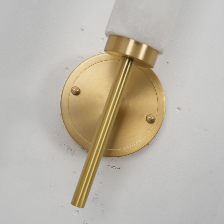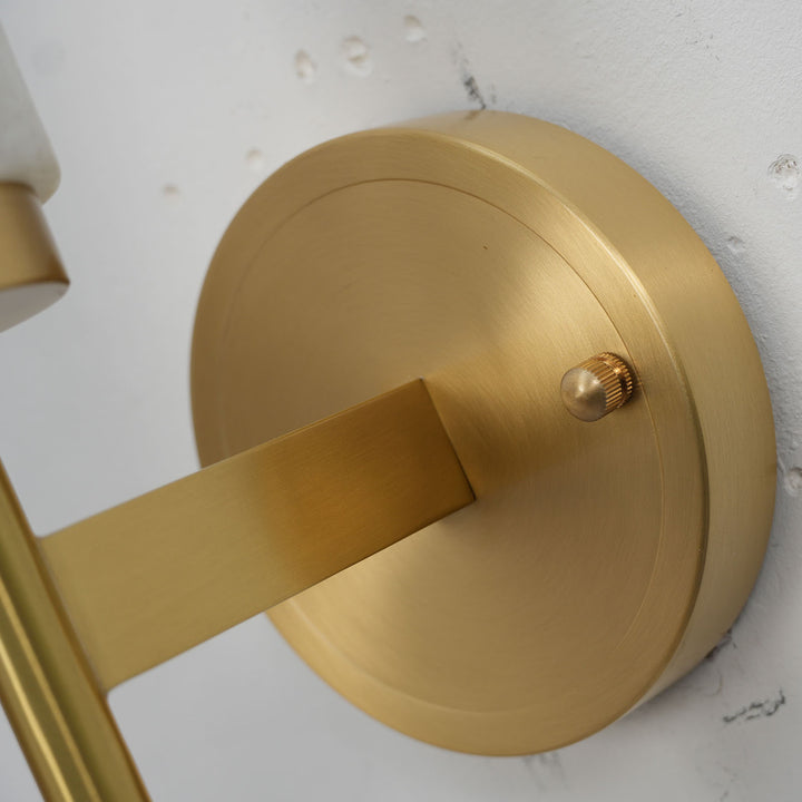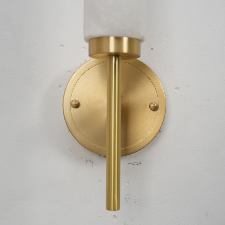 The Brindisi Brass Wall Sconce boasts an elegant design, with its graceful arm and disc-shaped perch for the opaque alabaster shade. Crafted from antique brass finished metal, this sconce exudes a clean and timeless beauty, complemented by the softly glowing white shade.
