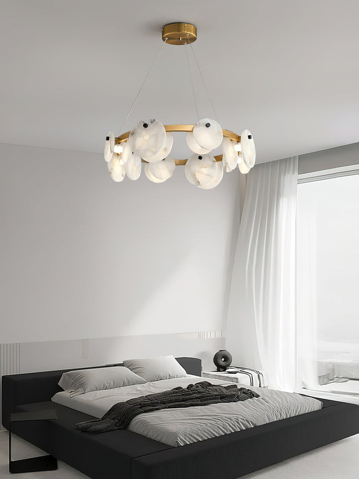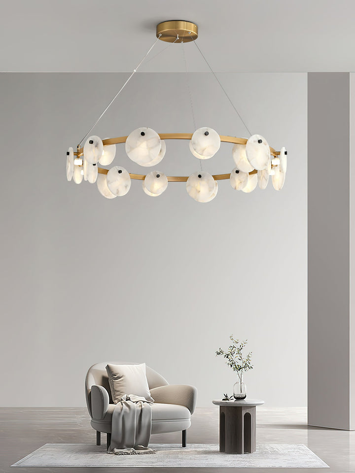 The Austen Chandelier is designed to provide an elegant light-filled atmosphere. Its open and airy structure ensures it won't overpower the room, while the thick alabaster disc shades reflect a soft, warm glow throughout the area. Perfect for any home or office, this fixture is sure to add a touch of sophistication.
