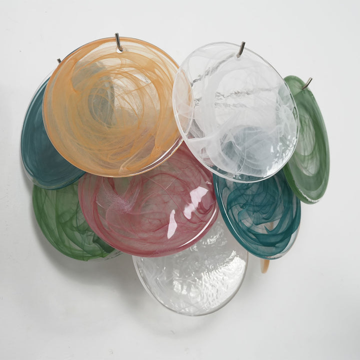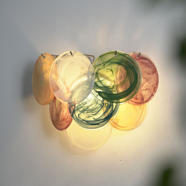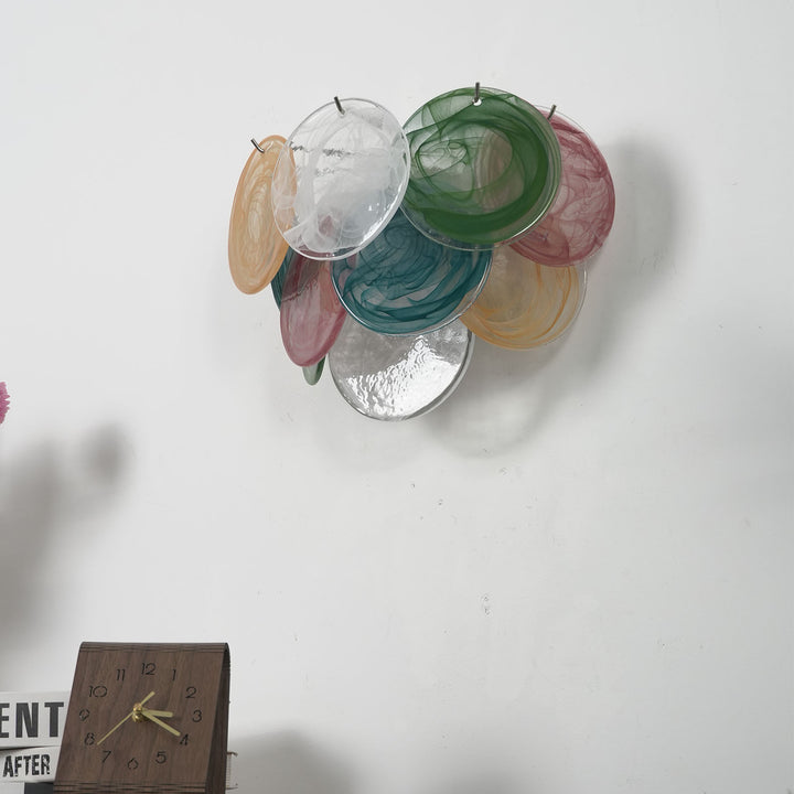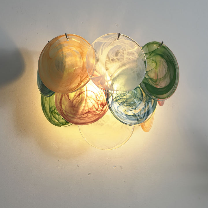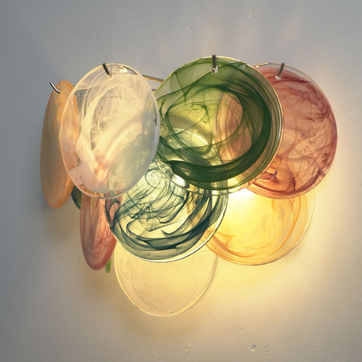 Bring sophisticated charm to any interior with the Colorful Murano Glass Discs Wall Lamp. Its finely crafted iridescent glass discs refract light into a vibrant spectrum, producing captivating visual effects. This distinctive wall lamp enhances your environment with both elegance and artistic flair.