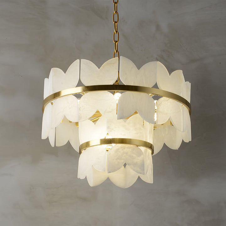 Discover the Alabaster Cloudscape Brass Chandelier, expertly crafted to evoke the calm and beauty of a peaceful sky. Featuring multiple layers of alabaster, its natural patterns and translucency emit a gentle, warm light that enhances any room. This exquisite chandelier brings refined elegance and a sophisticated ambiance to your living space.