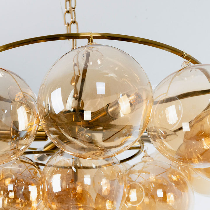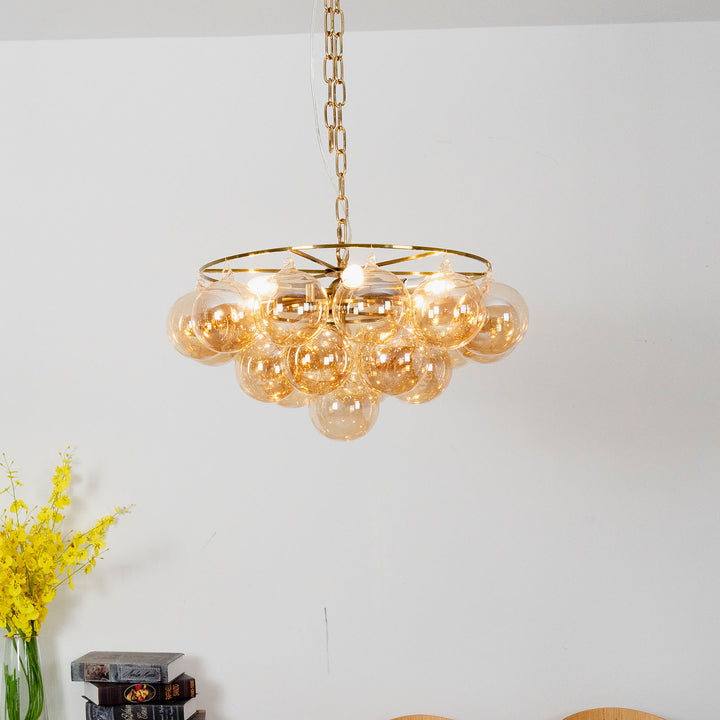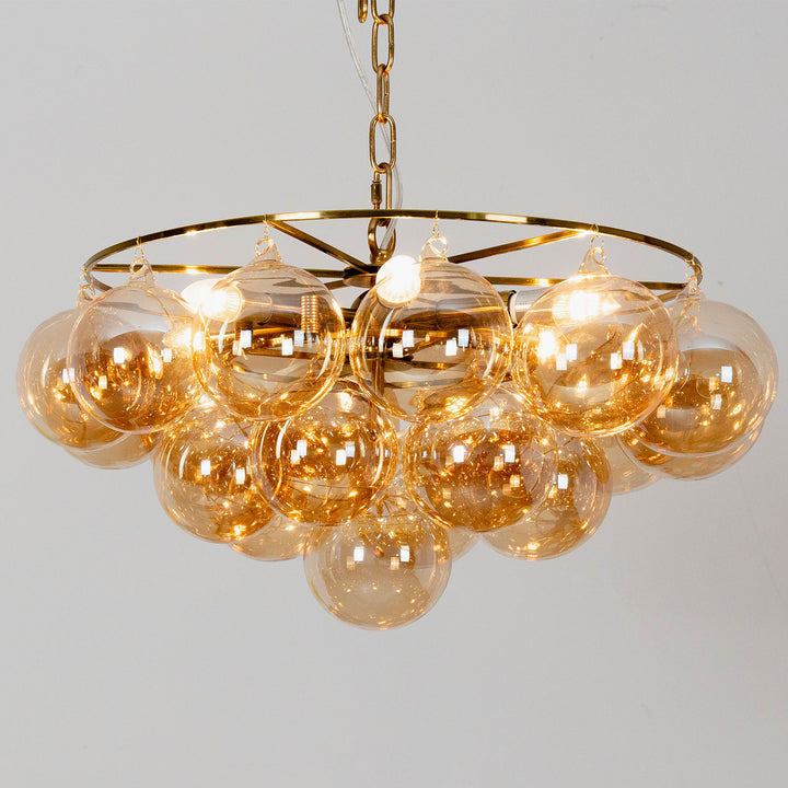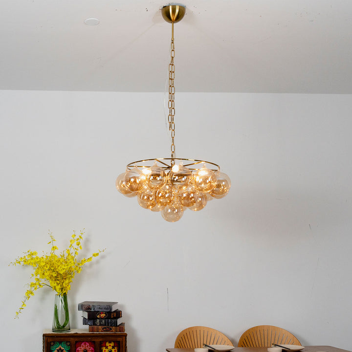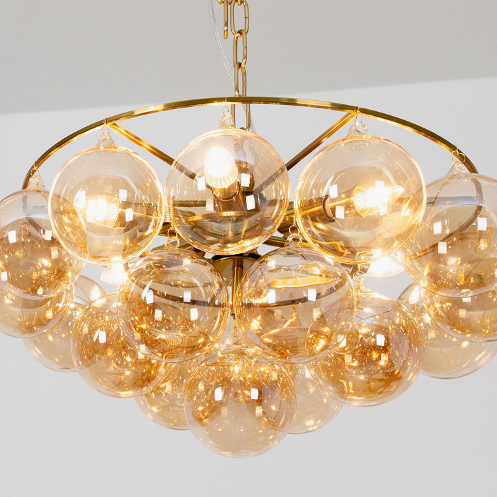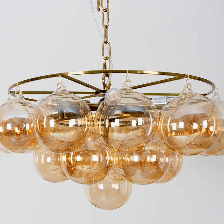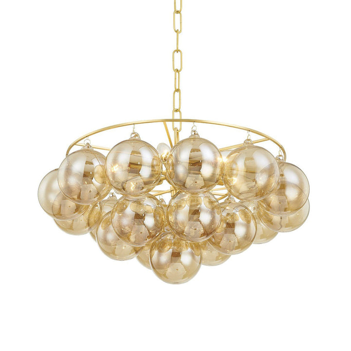 The Mimi Chandelier by Megan Molten showcases plated champagne glass globes paired with an Aged Brass frame, creating a luminous yet understated aesthetic. Its versatile configuration adapts to your space—functioning as a small chandelier, flush mount, or larger statement piece. Perfect for breakfast nooks, entryways, bedrooms, and dining rooms, this fixture brings refined elegance and sophisticated light to any interior.
