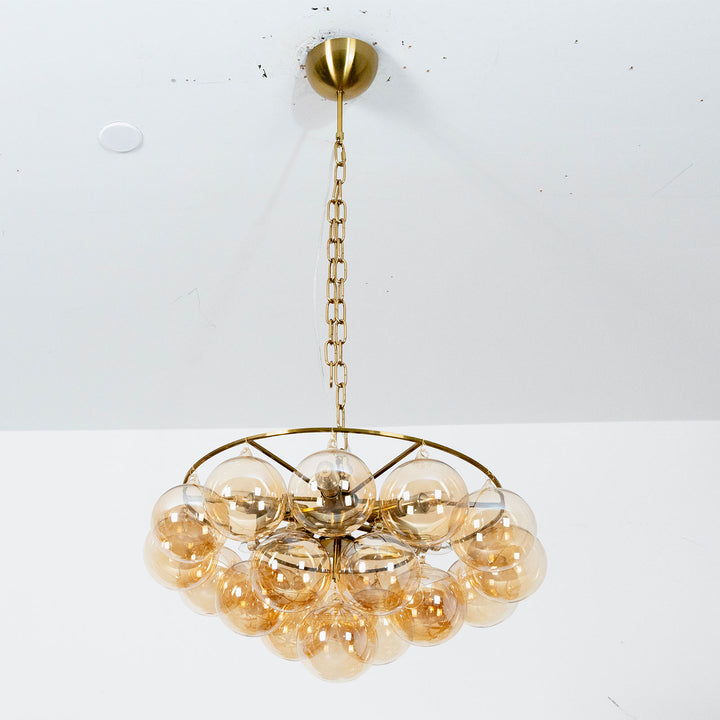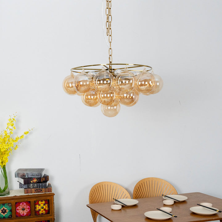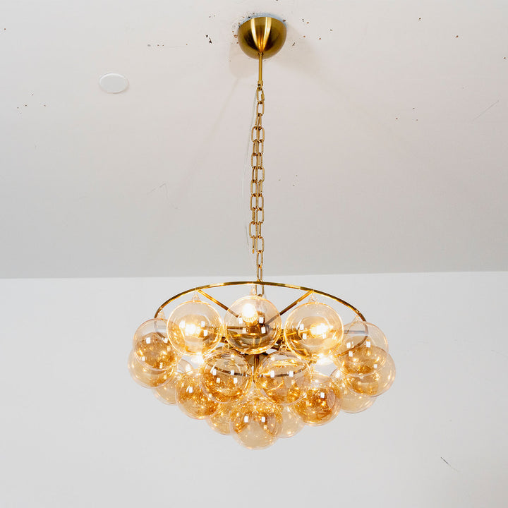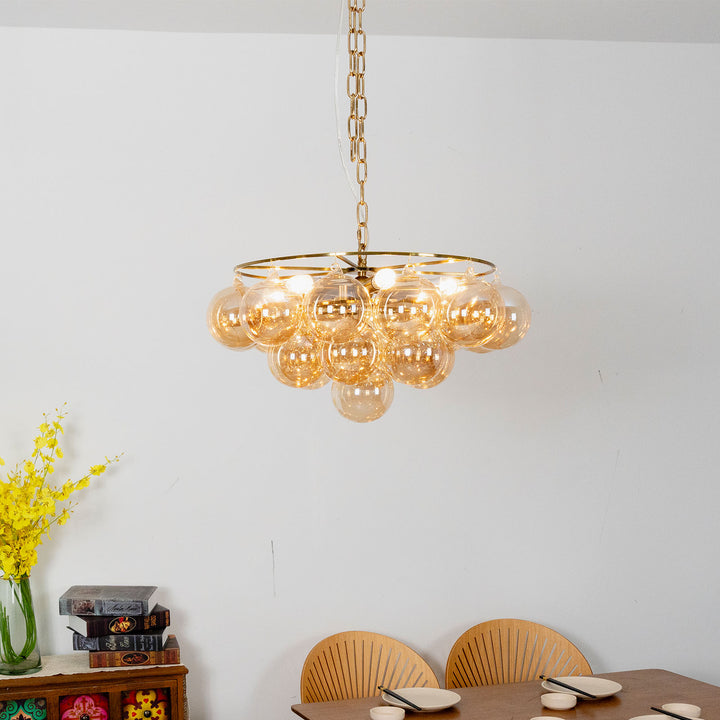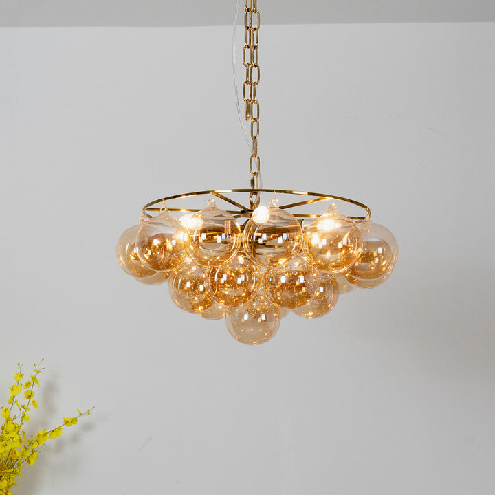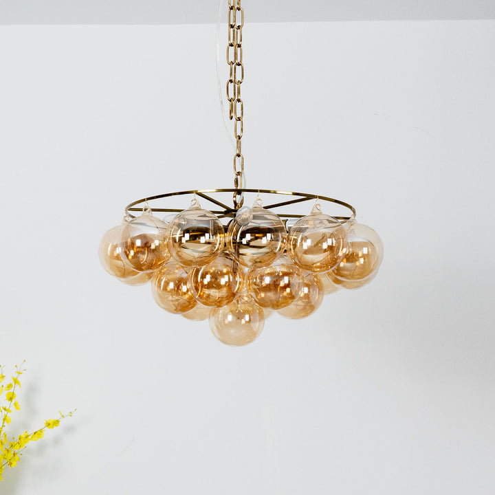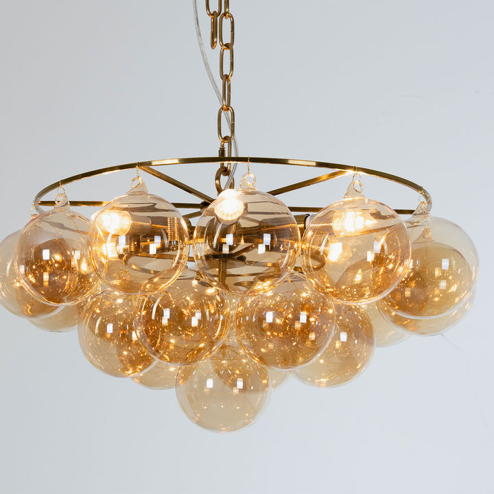 The Mimi Chandelier by Megan Molten showcases plated champagne glass globes paired with an Aged Brass frame, creating a luminous yet understated aesthetic. Its versatile configuration adapts to your space—functioning as a small chandelier, flush mount, or larger statement piece. Perfect for breakfast nooks, entryways, bedrooms, and dining rooms, this fixture brings refined elegance and sophisticated light to any interior.