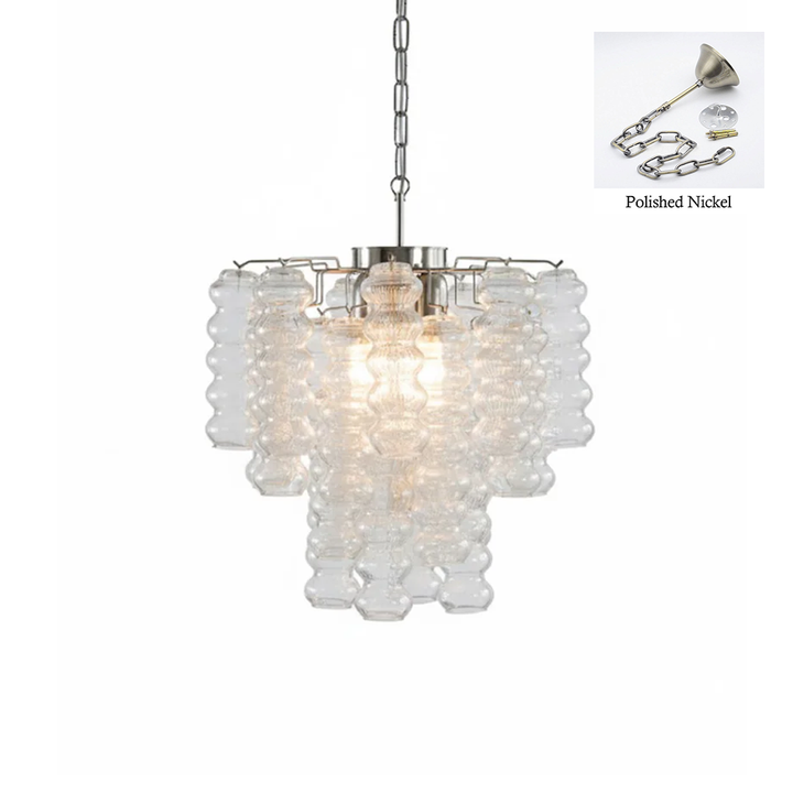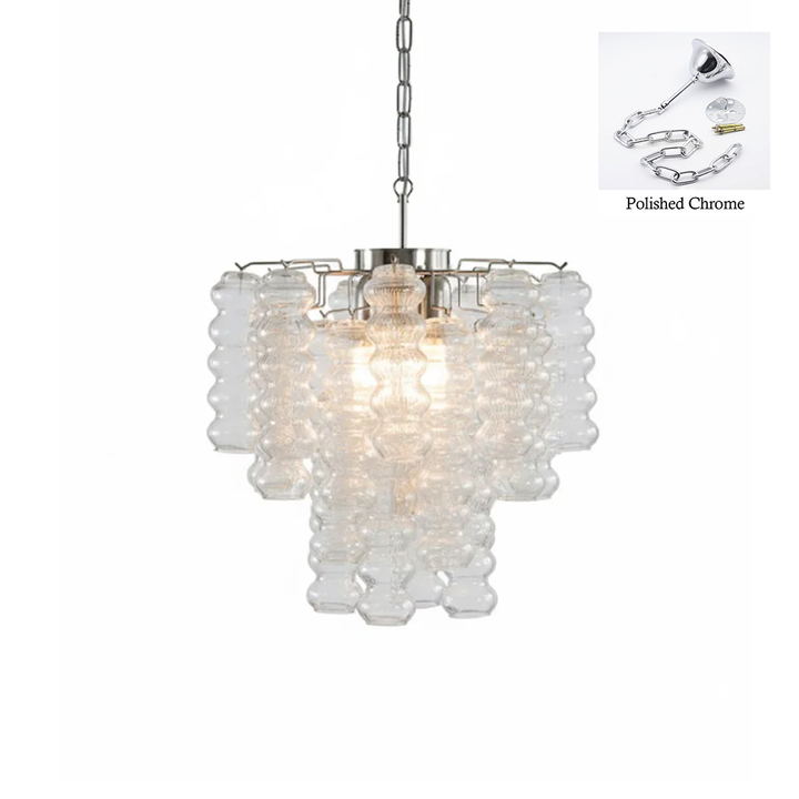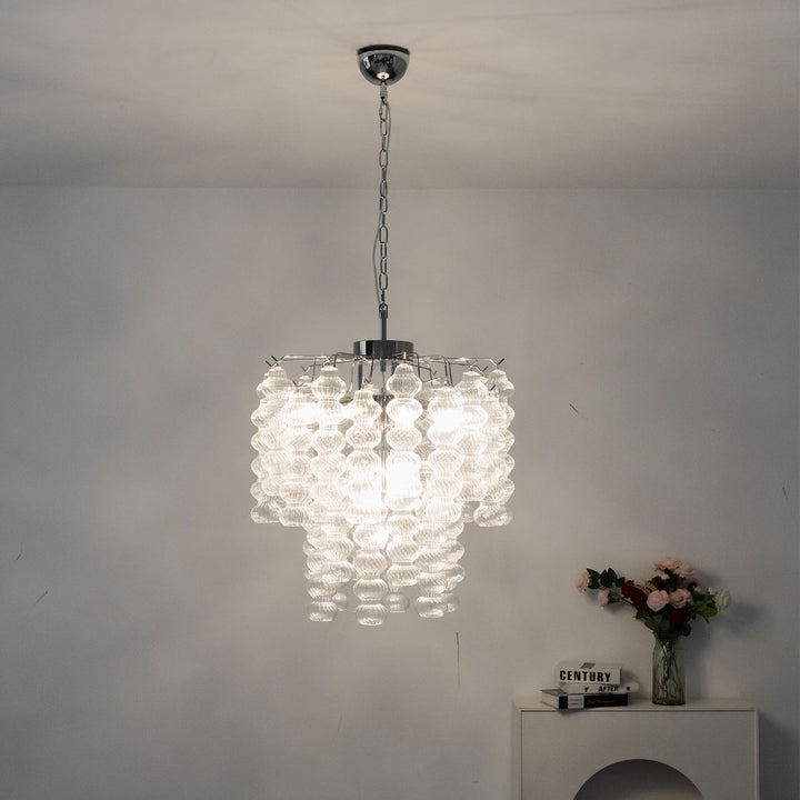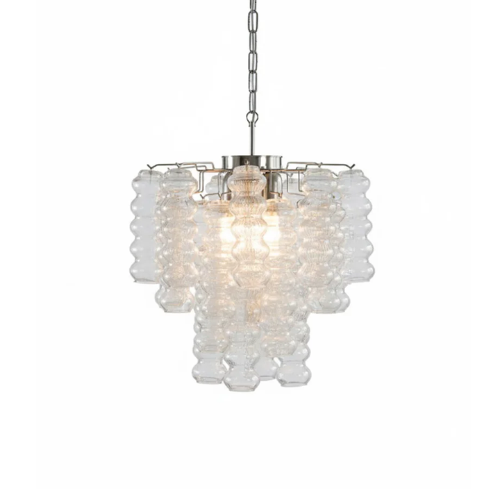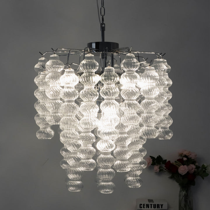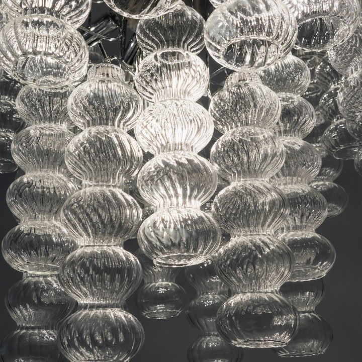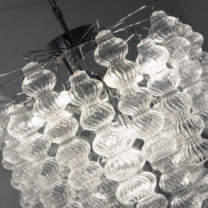 This Italian-crafted chandelier features rippled glass tubes that transform ambient light into nuanced patterns of refraction and glow. The undulating surface of each glass element disperses illumination across your room, establishing visual complexity and atmospheric depth.