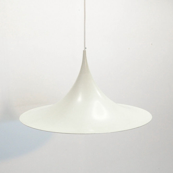 Semi is a unique pendant lamp, based on two quarter-circles put together, back-to-back. With its distinctive arch-shaped, enameled metal shade, lightness of form and unique, timeless design, the elegant Semi lamp achieved great success in the 1980's and became, at that time, the best-selling Danish design, gaining worldwide recognition and iconic status. It´s distinctive arch-shaped shade in lacquered, spun aluminum creates a diffused, cone-shaped light, ideal over a dining table or kitchen work surface.